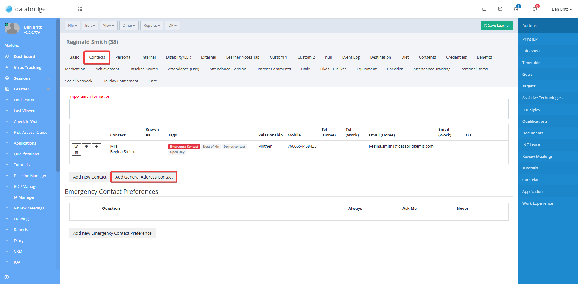 Contacts - Here you can add an individuals contact details. For instance, you may have several student's with the same GP Practice attached as a General Address. Under the Contacts tab, you can add the individual Dr that each Student may be registered too.