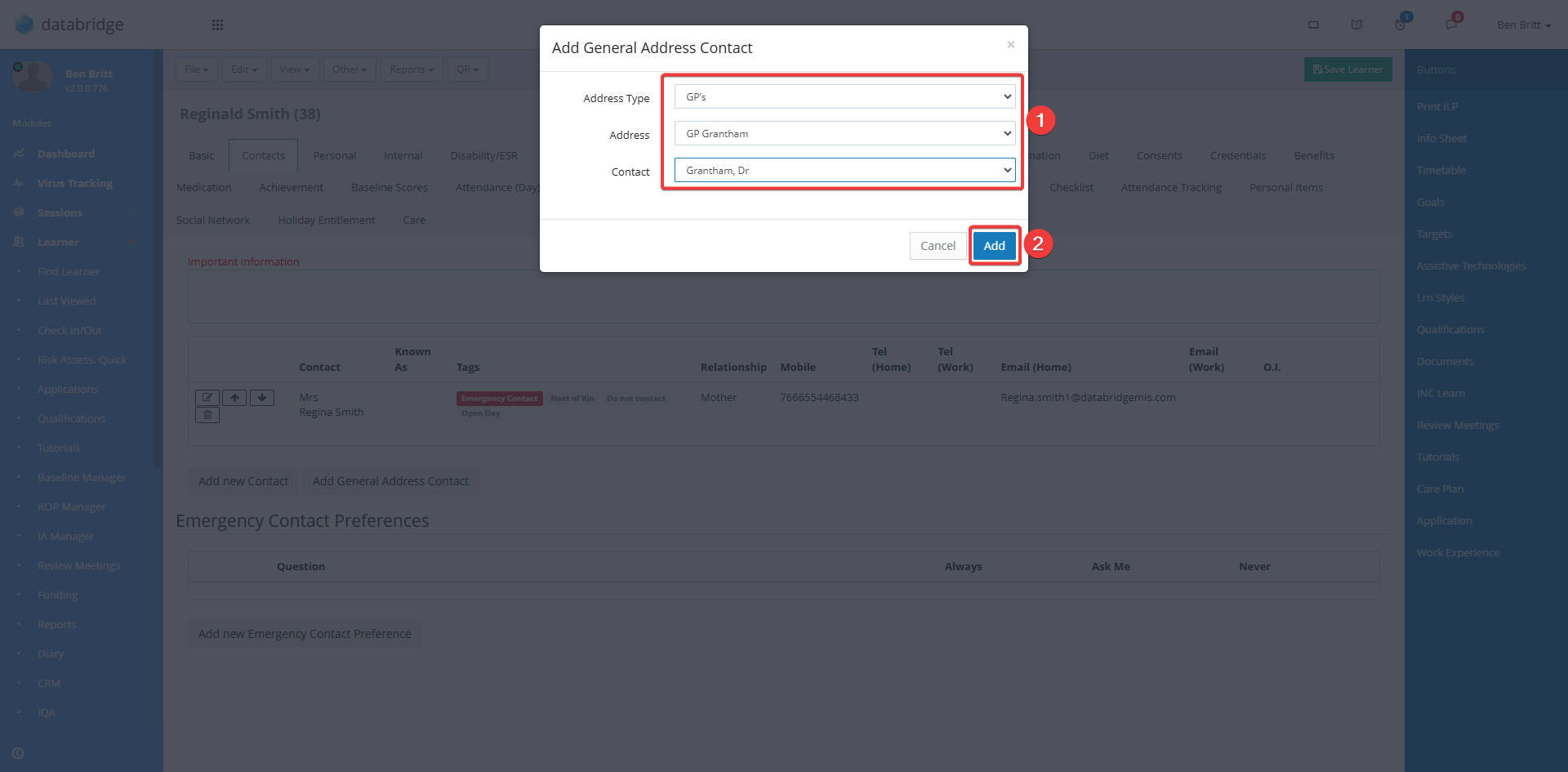 Firstly, using the Address Type dropdown, select the address type, for example GP. Depending on your selection from the Address Type dropdown, it will populate the Address dropdown. For example, if GP is selected, you will now be shown a list of GP addresses. Once you have made your Address selection, a new dropdown will appear labelled Contact. All contacts attached to the address selected will now appear here. Once you have populated all 3 dropdowns, click Add.