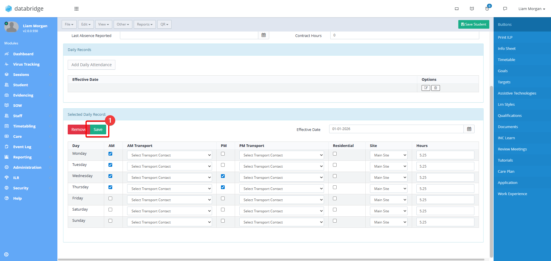 Note: You can set multiple daily records to account for the student being expecting in for different days through the year. For example, set the effective date for Autumn term and then set the appropriate details for Monday, Tuesday and Thursday. Then, create a new daily attendance with the effective date set for Spring term and the appropriate details for Monday, Wednesday and Friday. All the daily records will be taken into when reporting on attendance.