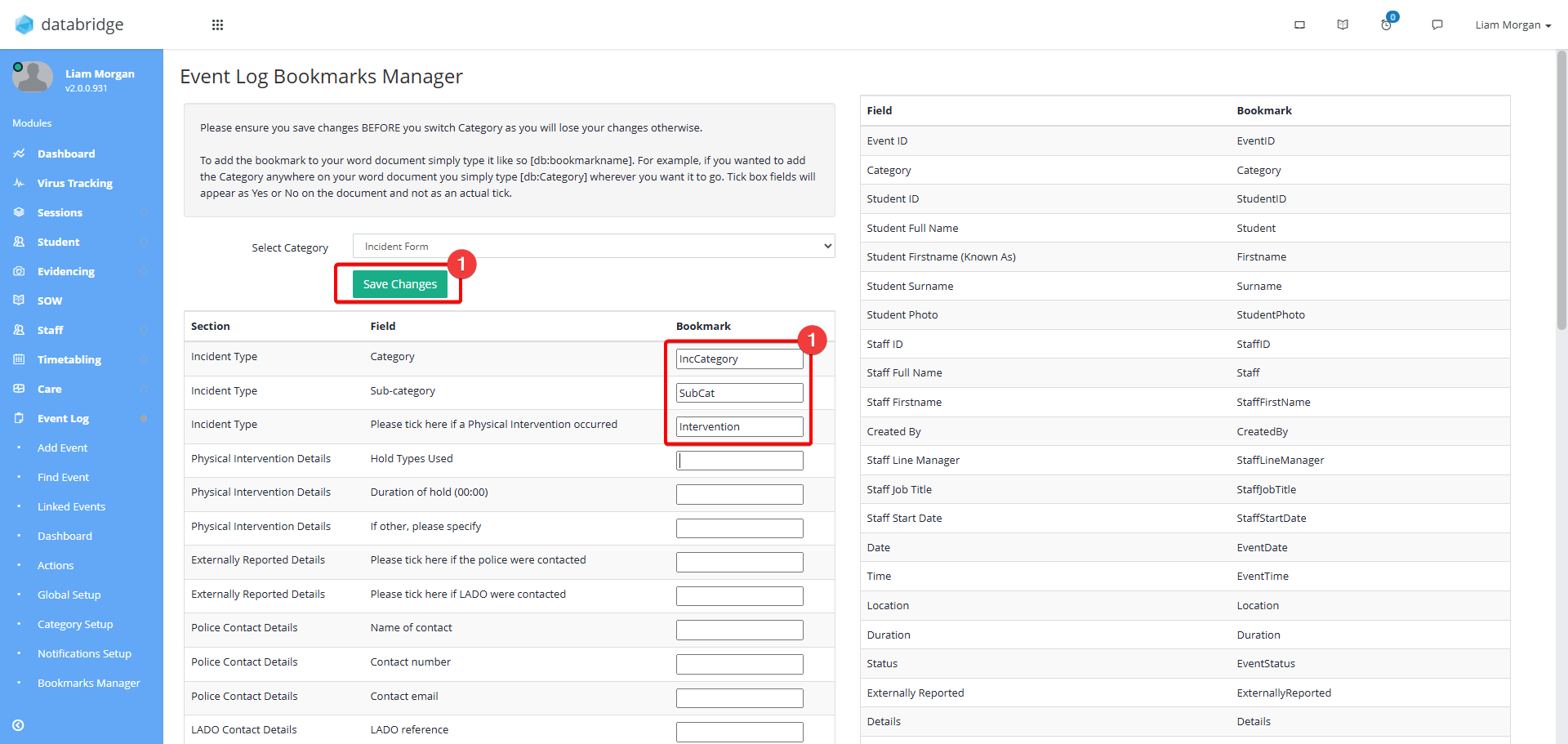 3. Enter a unique bookmark against the Event Log fields that you want to include in the Template. Examples of this can be seen in the screenshot below, then click Save Changes.