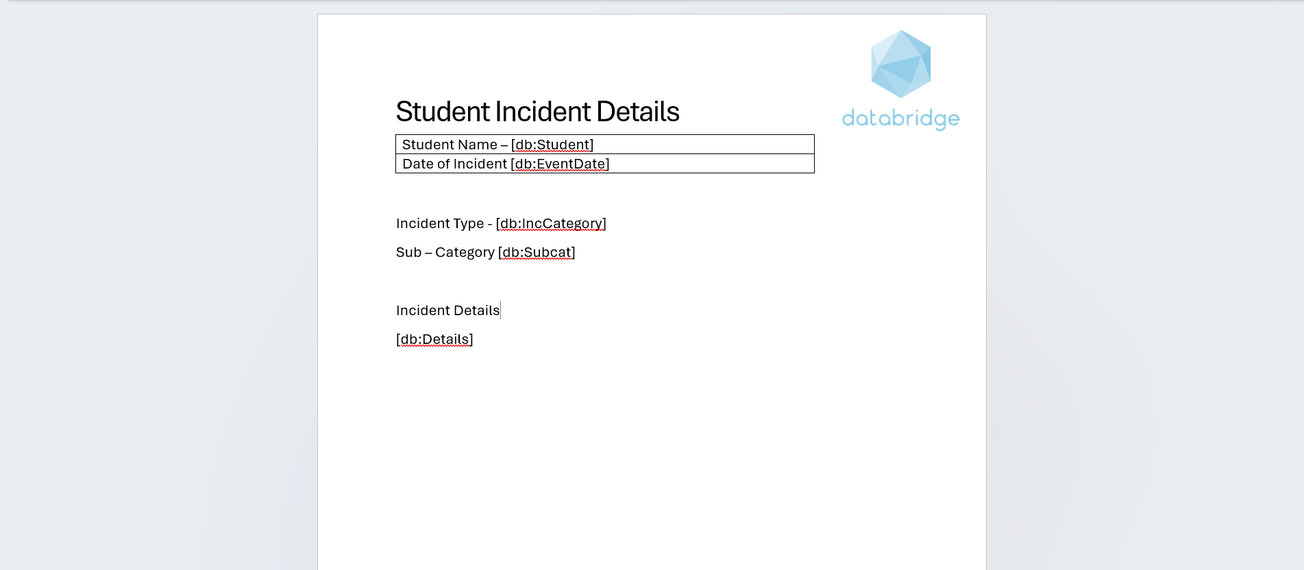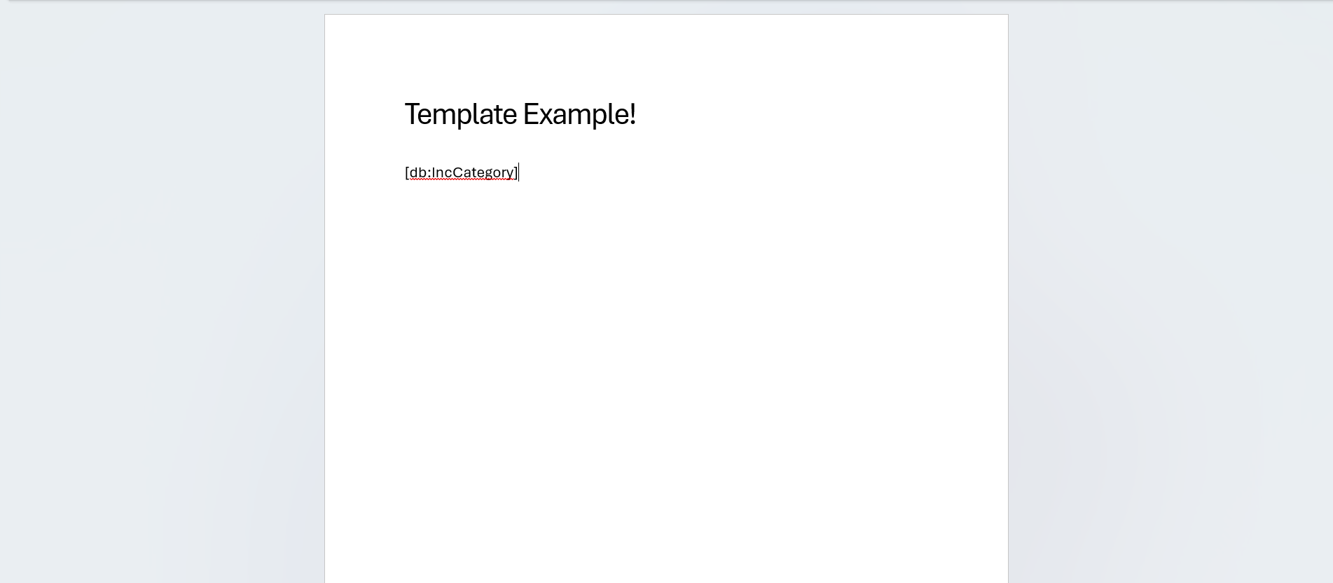 To use the bookmarks in the template, they need to be added in the following format [db:BookmarkName], for example if the bookmark created in the Bookmarks Manager was IncCategory, the word document would need to contain [db:IncCategory].