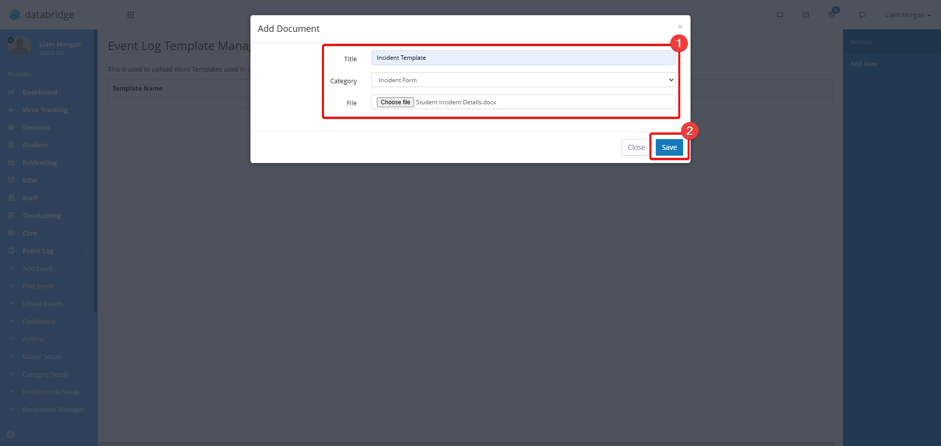 9. Give your template a Title, select the Event Log Category to be linked to and upload the Template. Then, click Save.