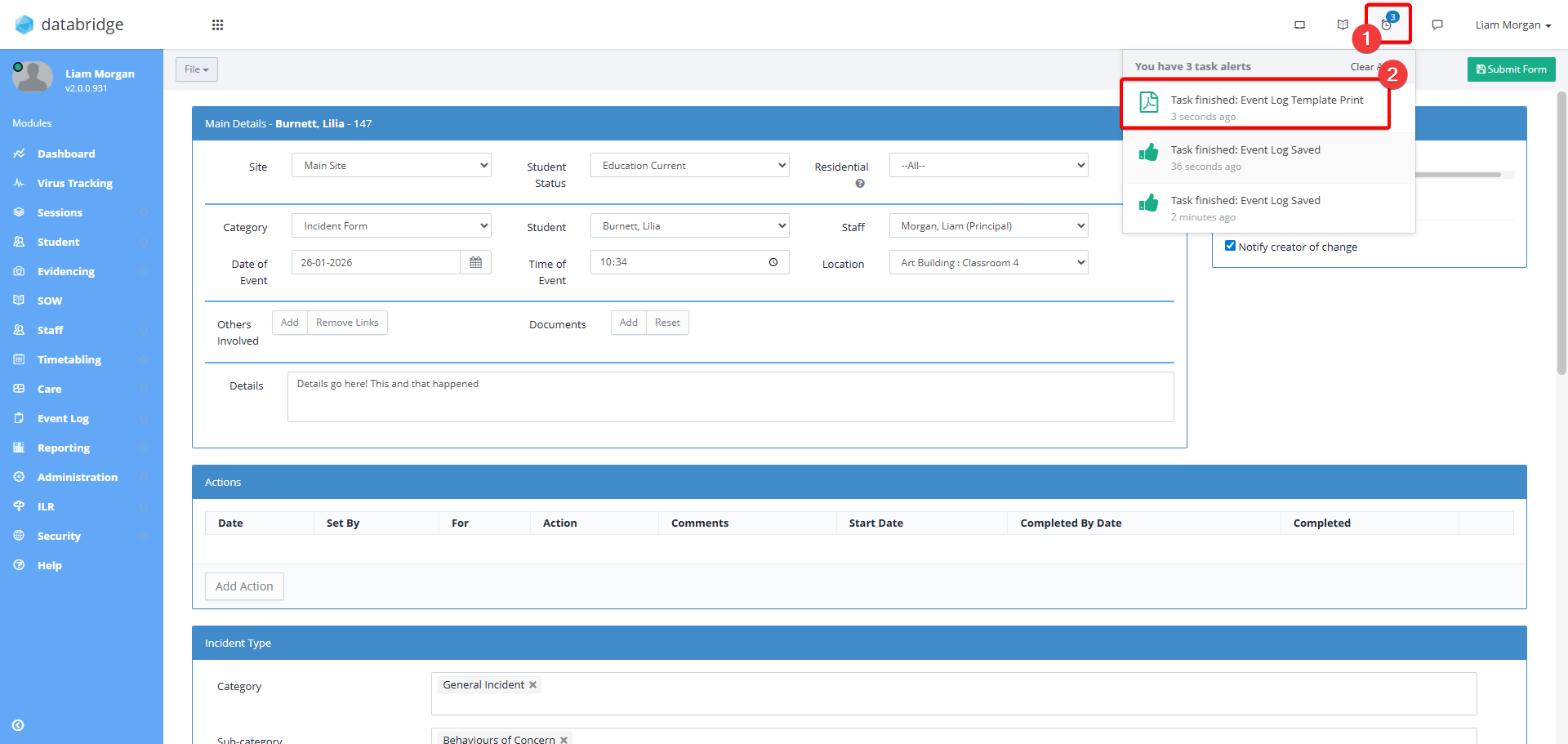 10. First navigate to the Event Log you want to print to Template. More information on finding / viewing Events can be found Here.