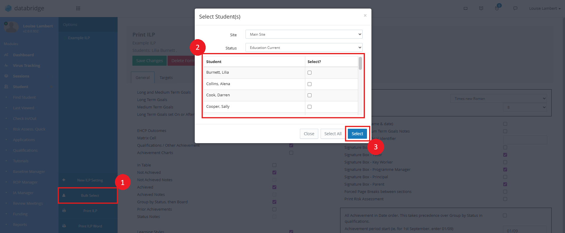 6. If you wish to print more than one ILP at once, you can click Bulk Select, tick all relevant Students and click Select.