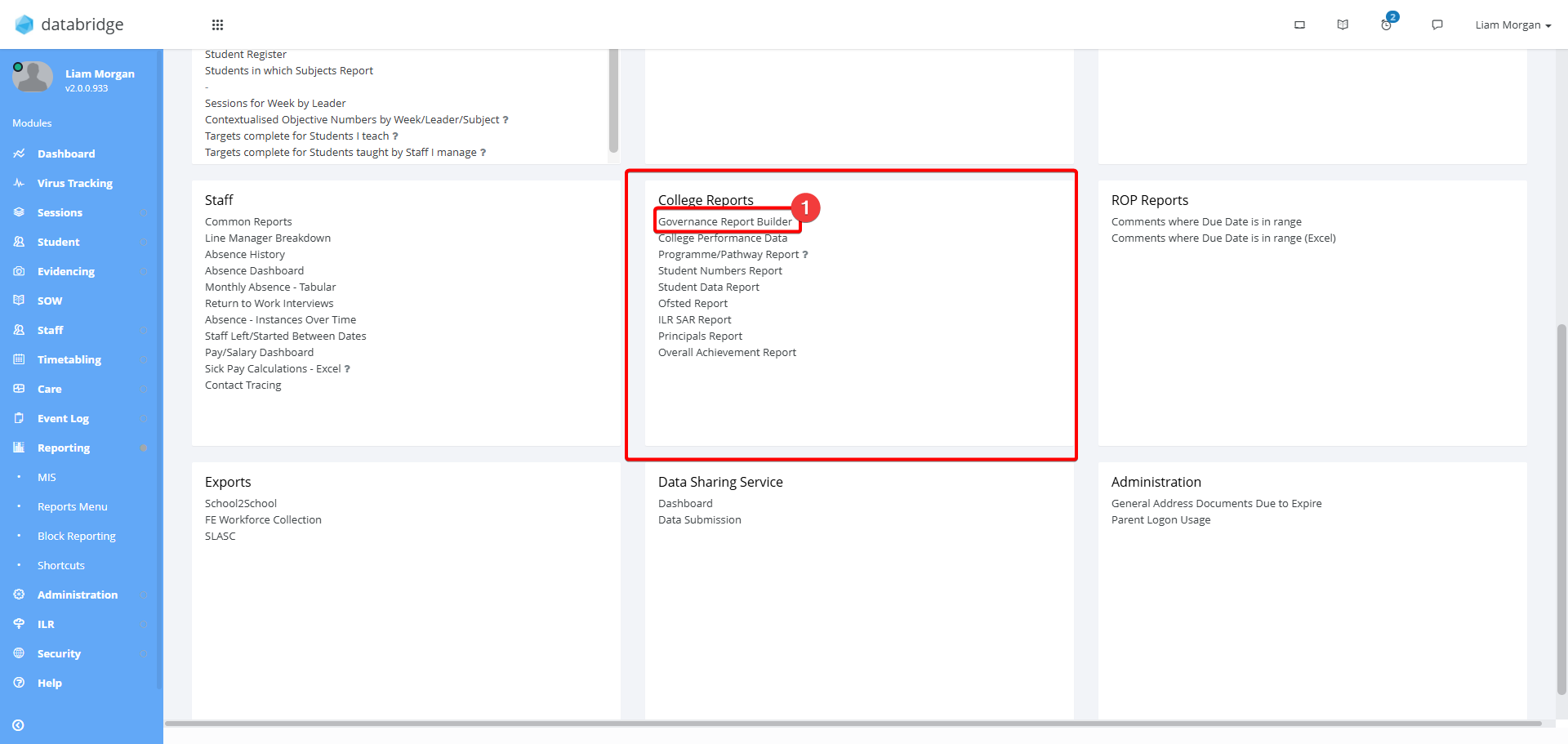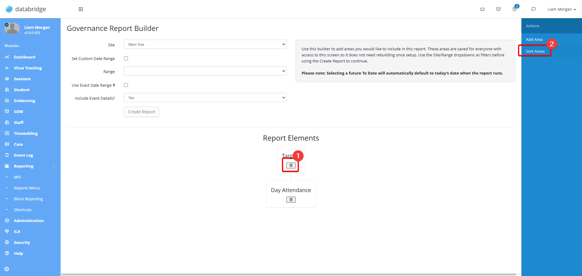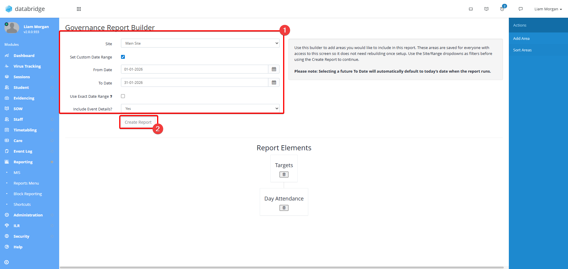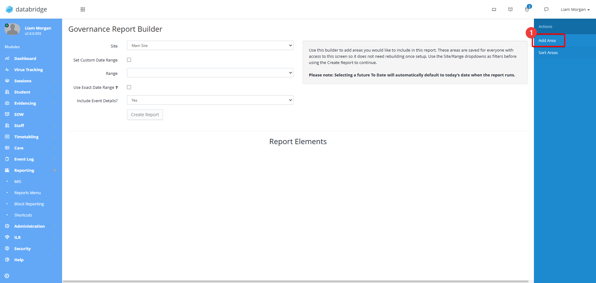 This guide will look at how to use the Governance Report Builder. This area of the system allows you to compile information from multiple areas, such as Attendance, Event Logs and Targets, into a single report.
