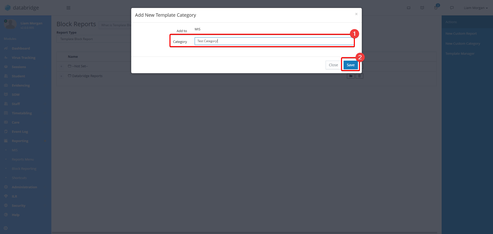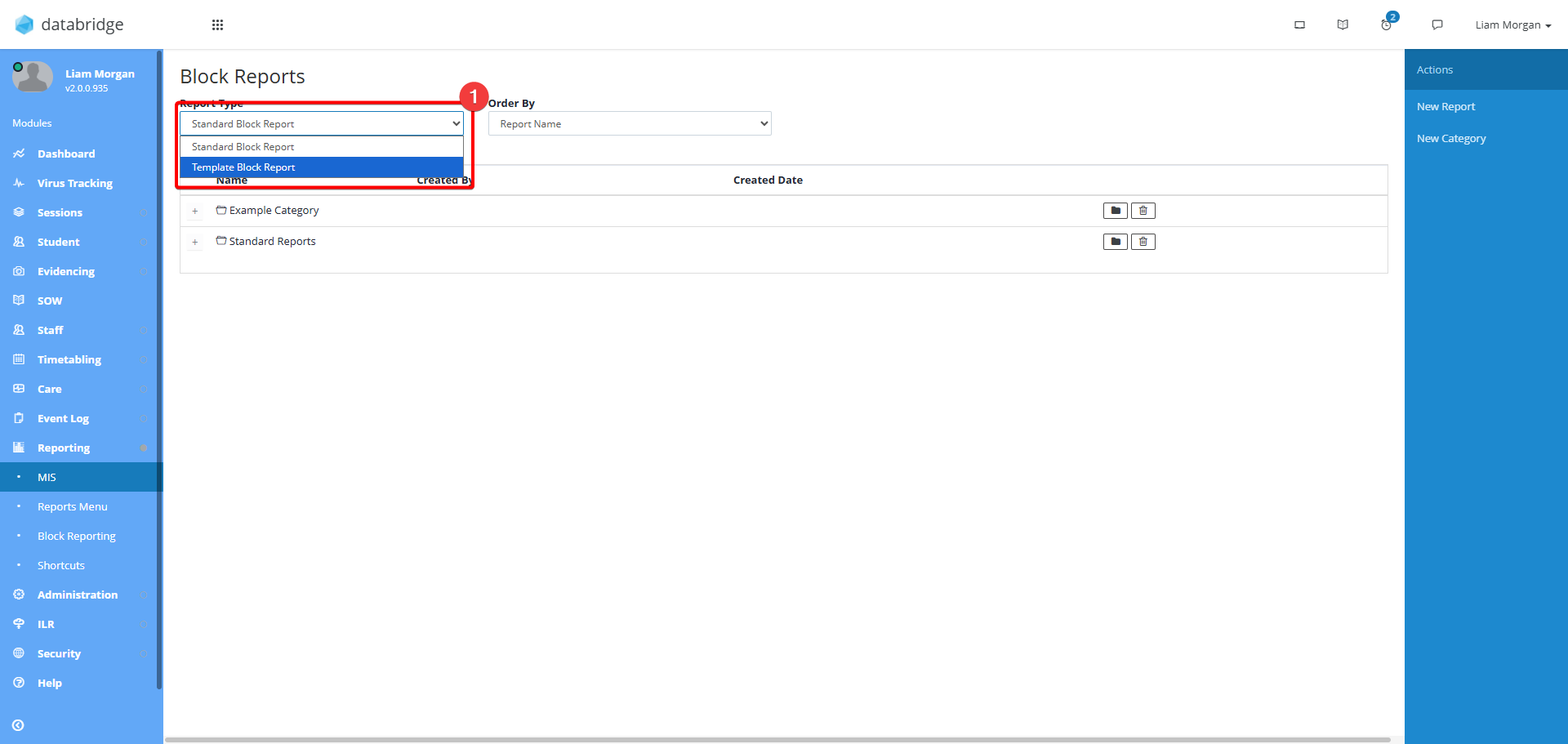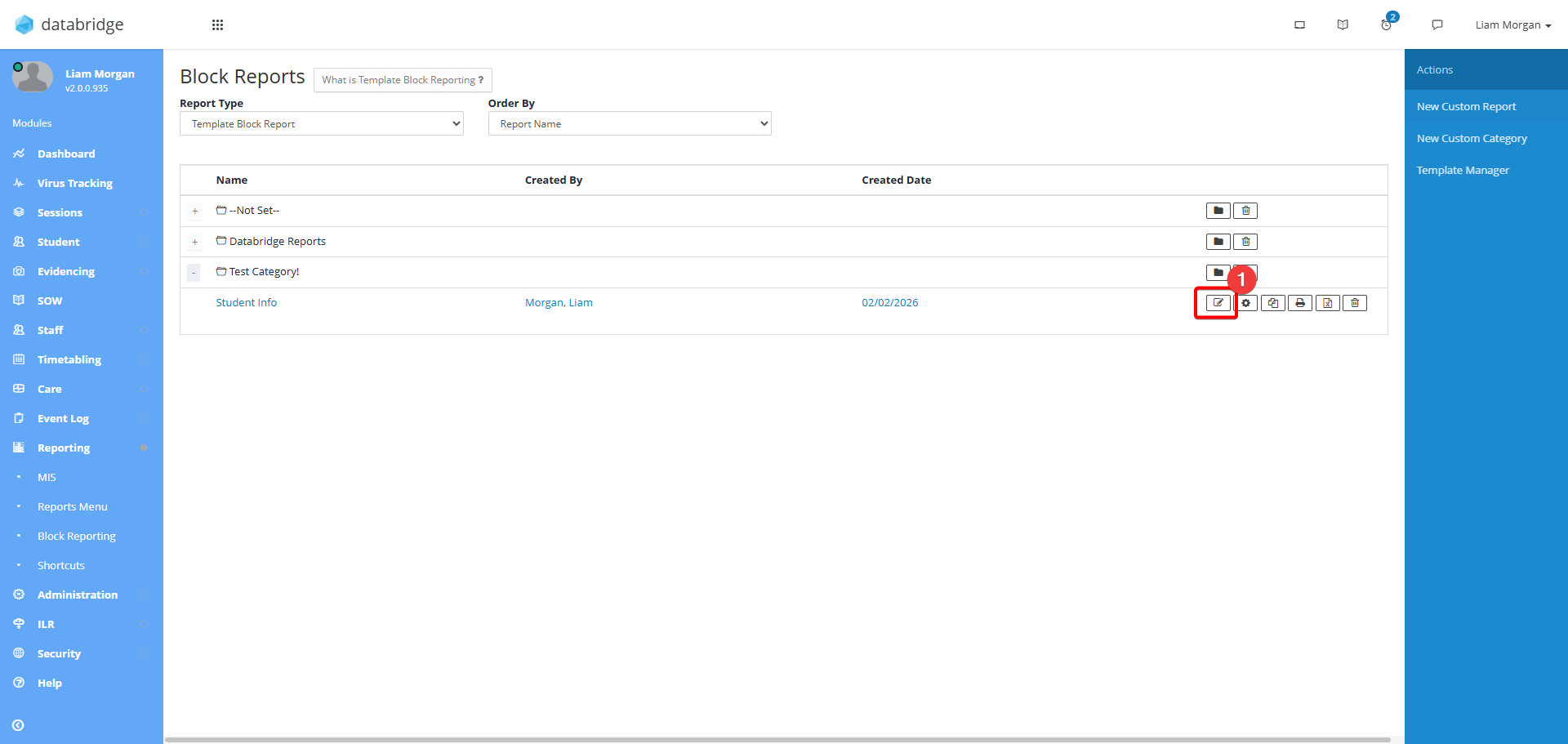 3. This screen will show you any existing Template Block Reports. To create a new folder to organise these click New Custom Category.