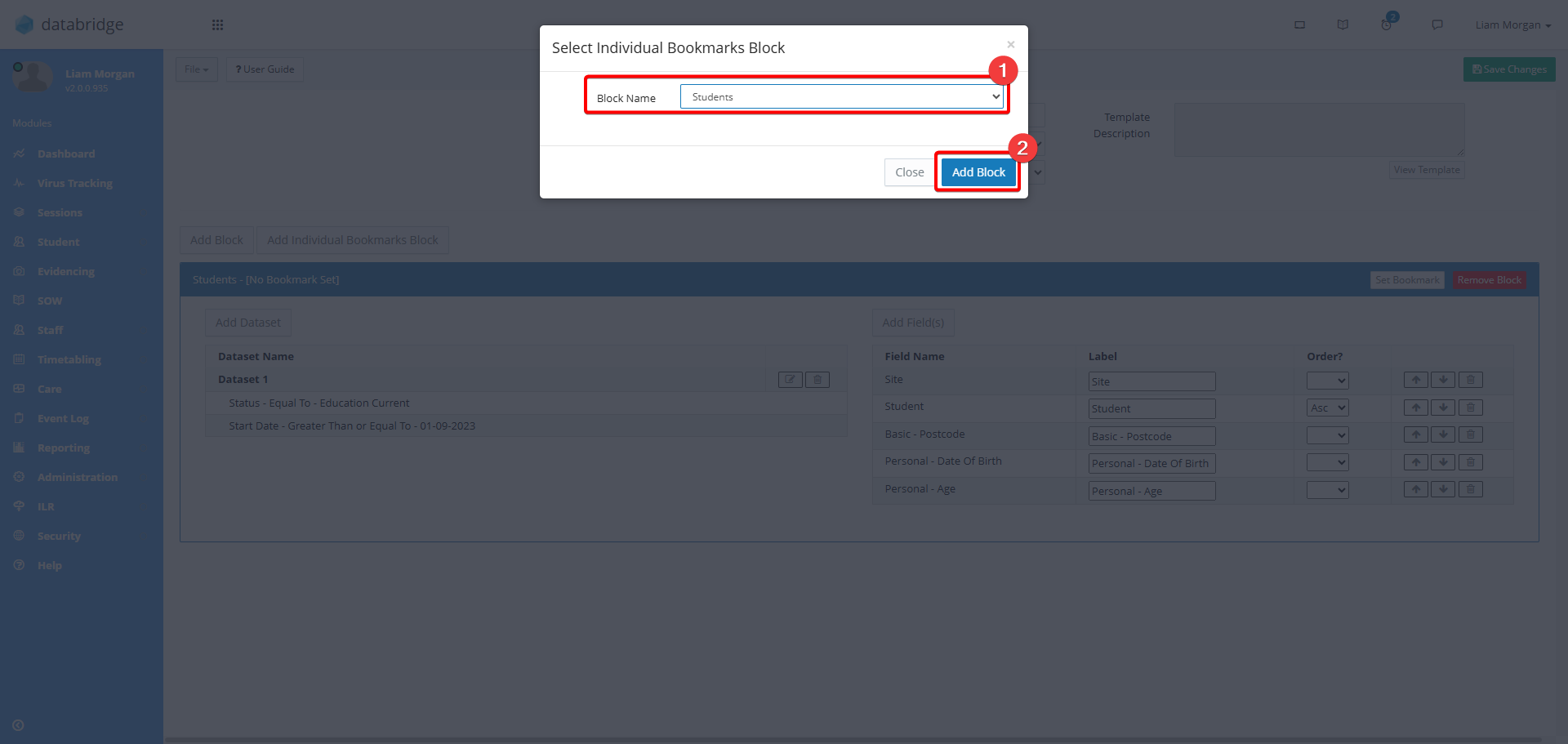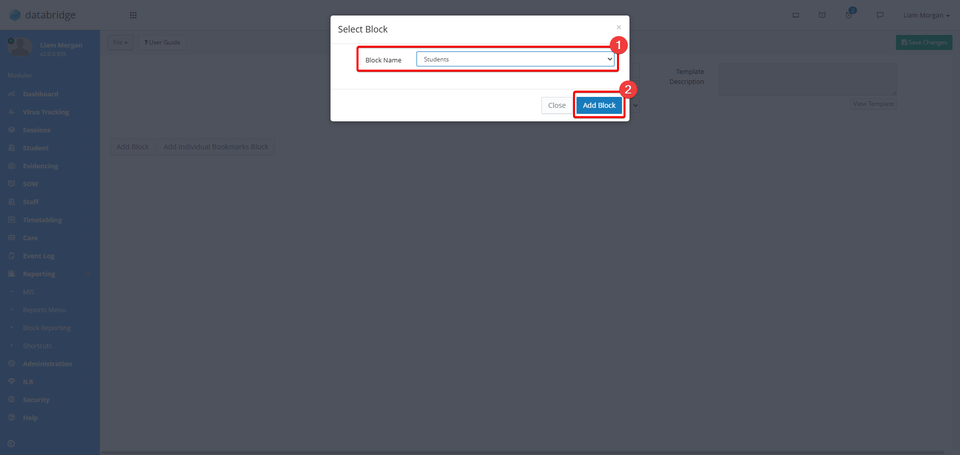 7. Click Add Block. The term 'Block' refers to the general area where information will be pulled from, such as Students, Staff, or Buildings, for example.