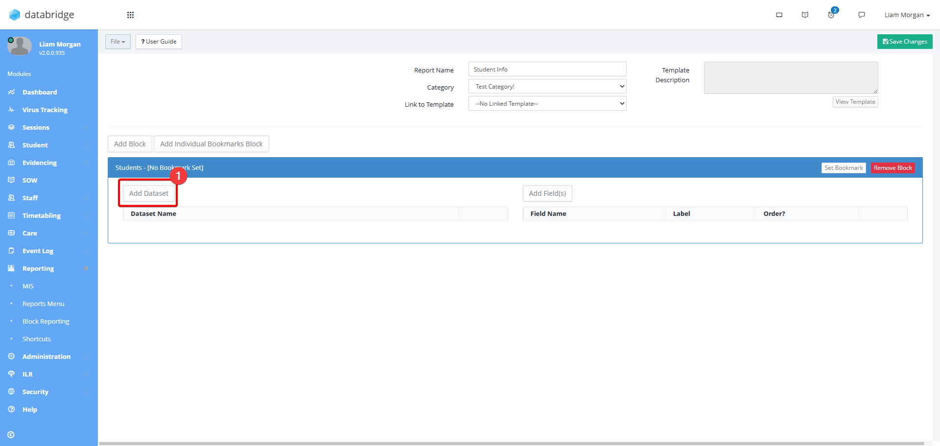 9. The selected Block will now appear on screen, with the option to Add Dataset, and Add Field.