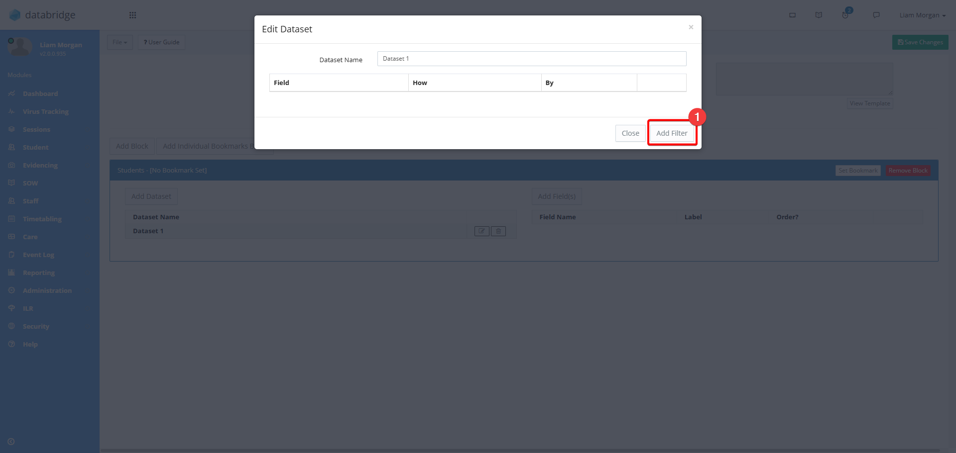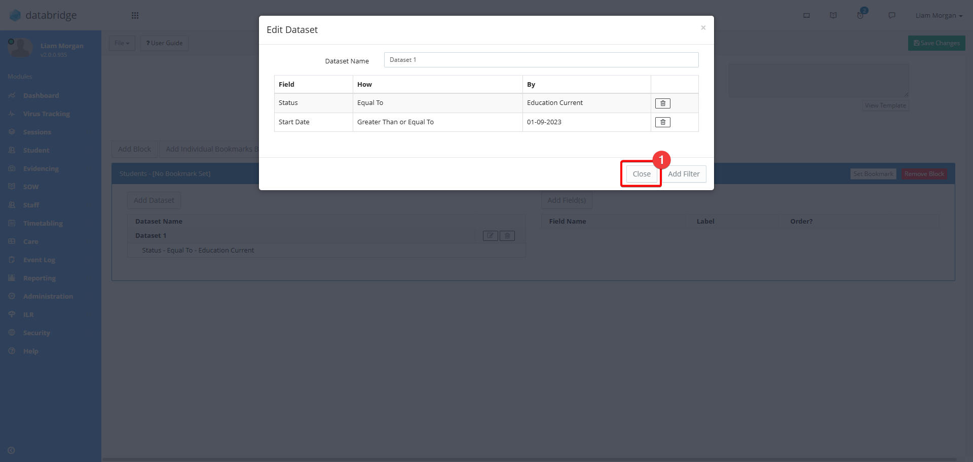 10. Click the Add Filter button to then bring up a window where you can then use the dropdown to select the specific criteria you want the report to check for. For example if you wanted to look at Current Students that started after September 2023 you would need to add two filters: