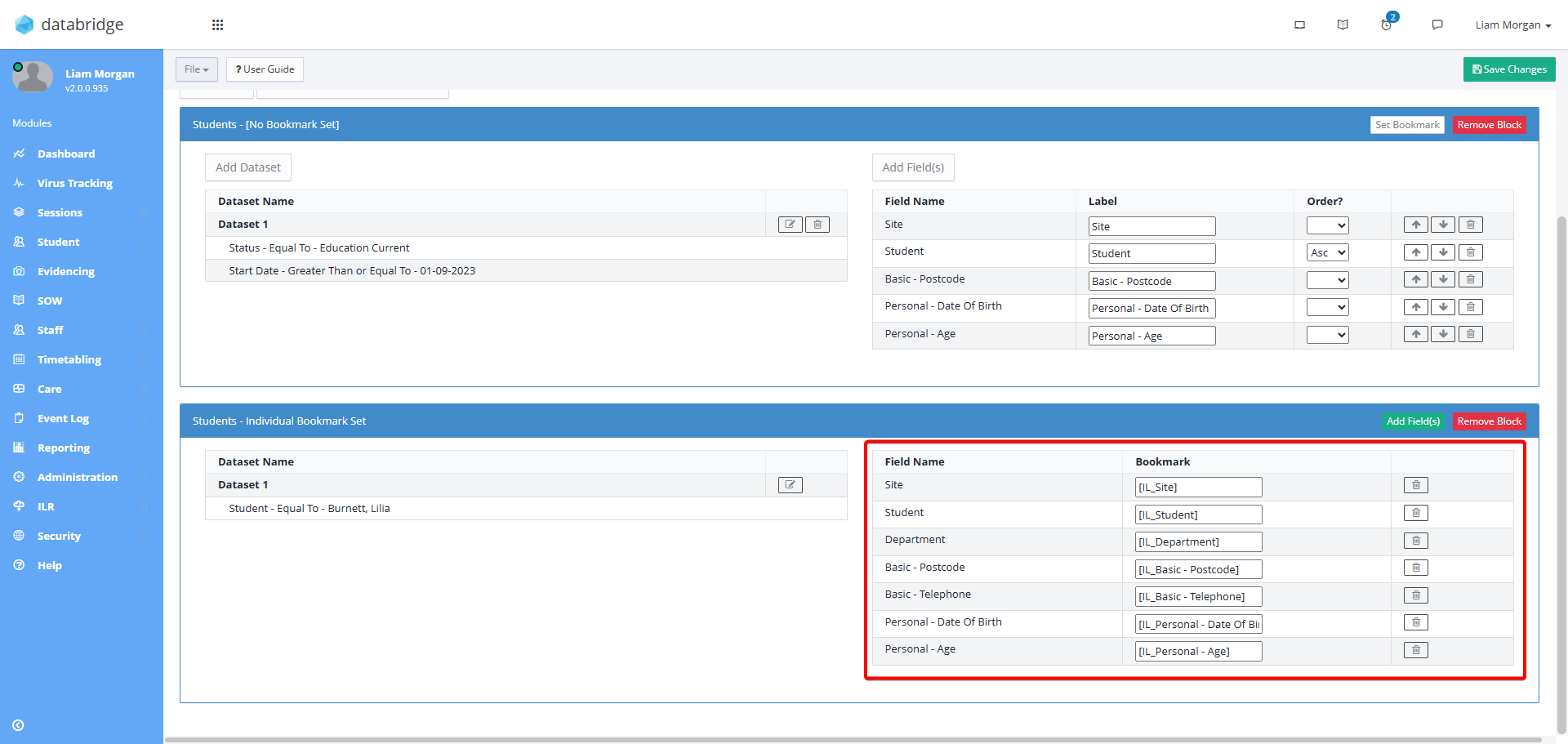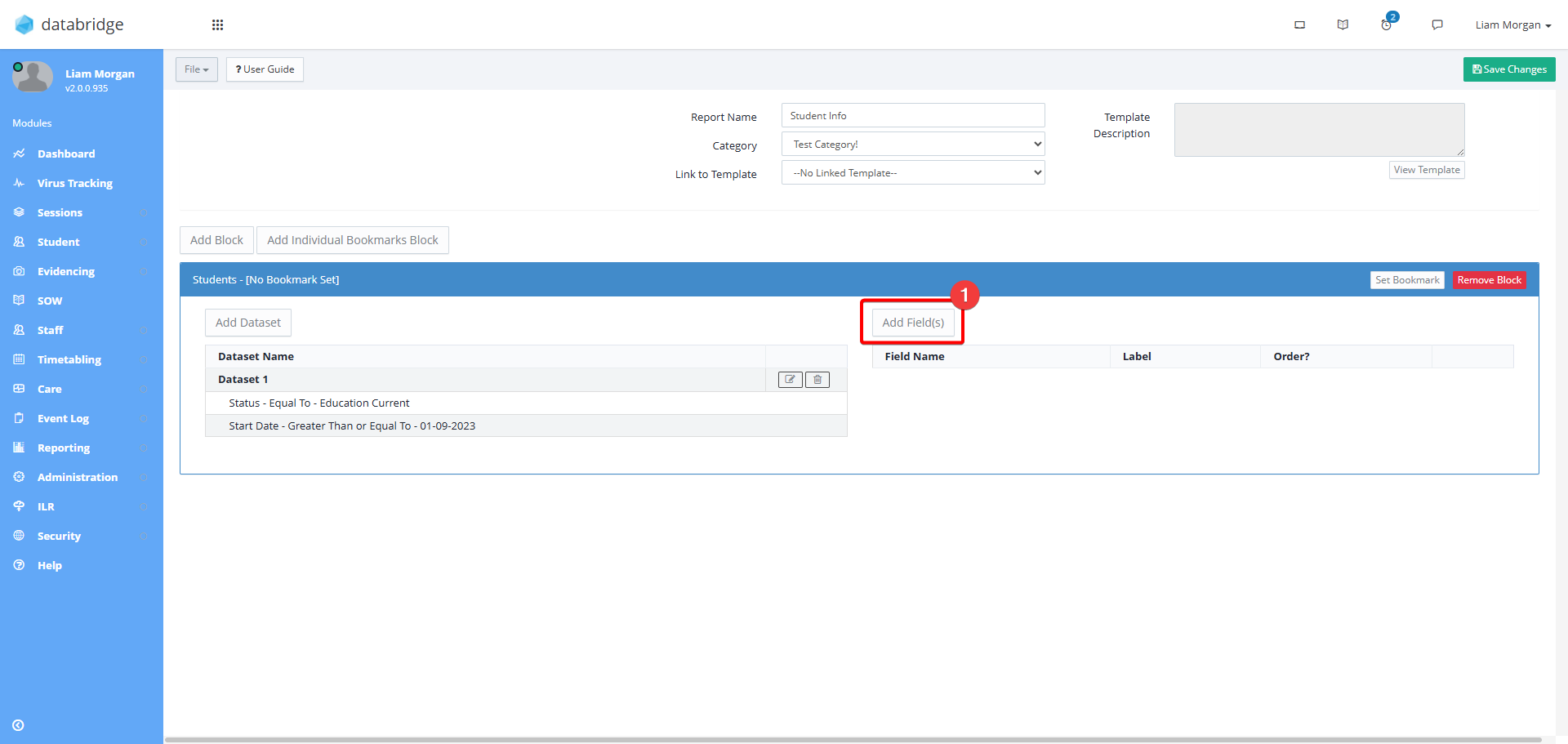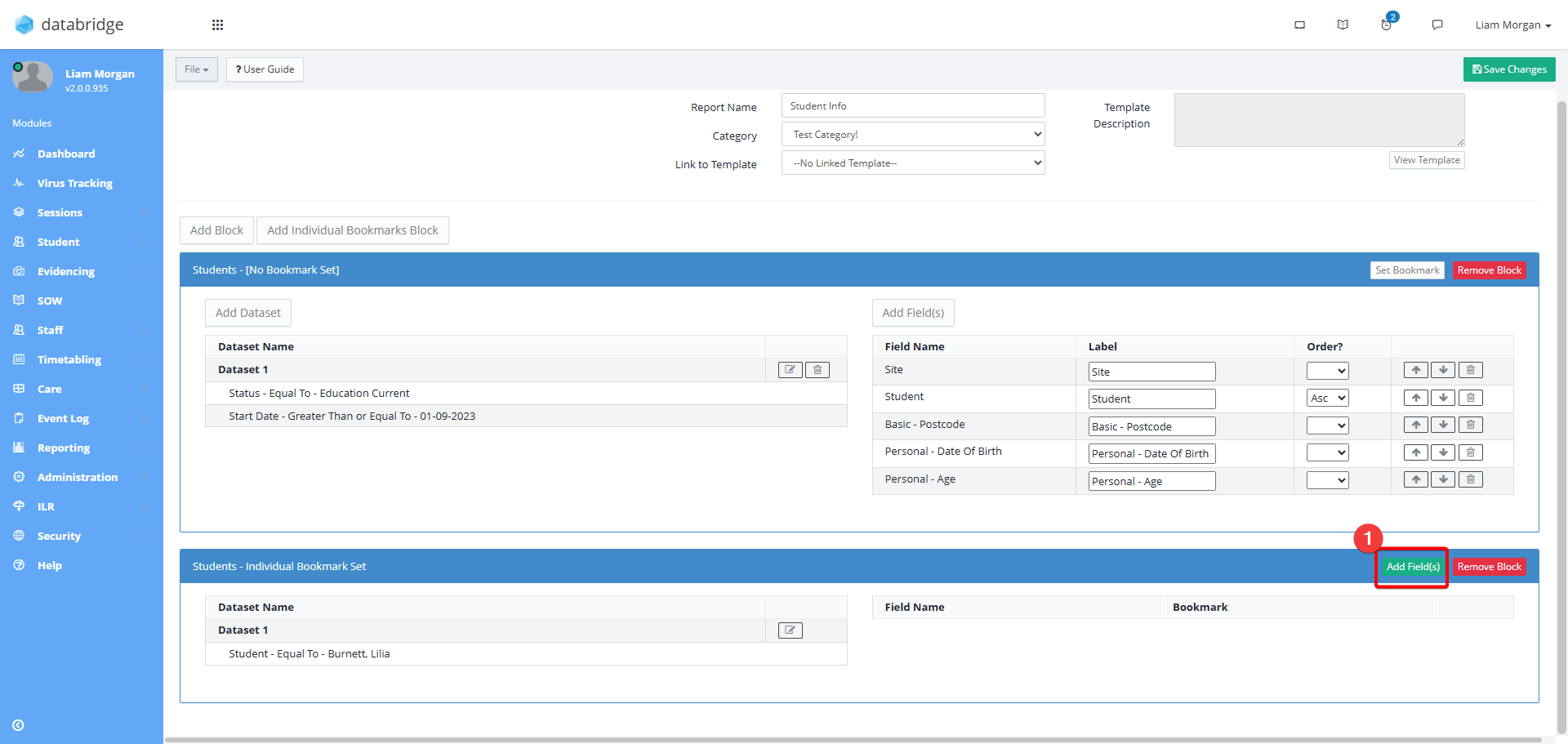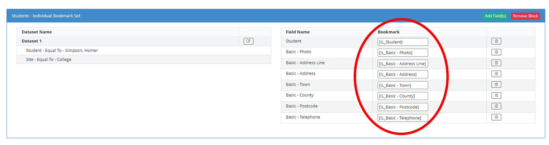 19. Next, to add the fields that you wish to create Bookmarks for, click on the green Add Field(s) button on the right of the Block.