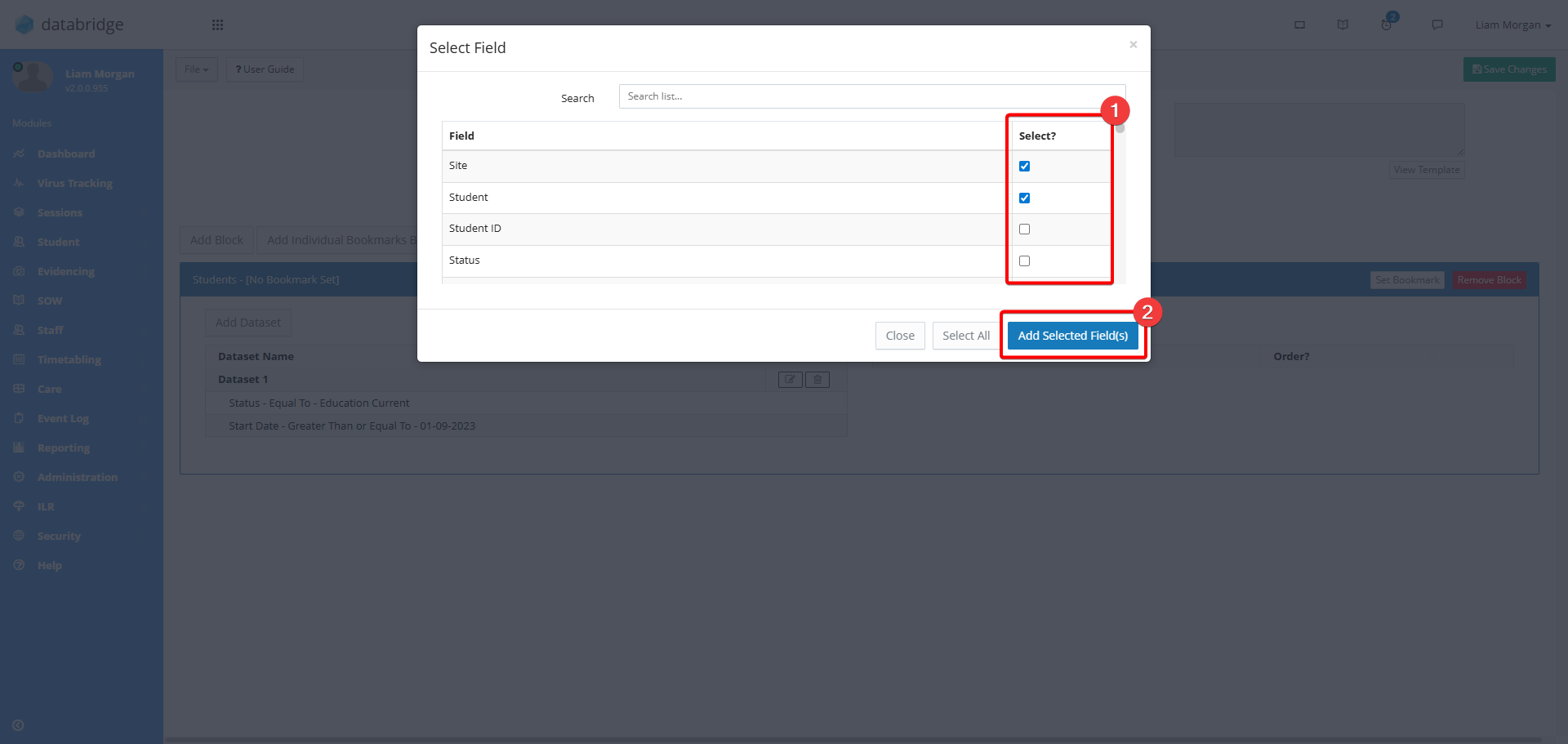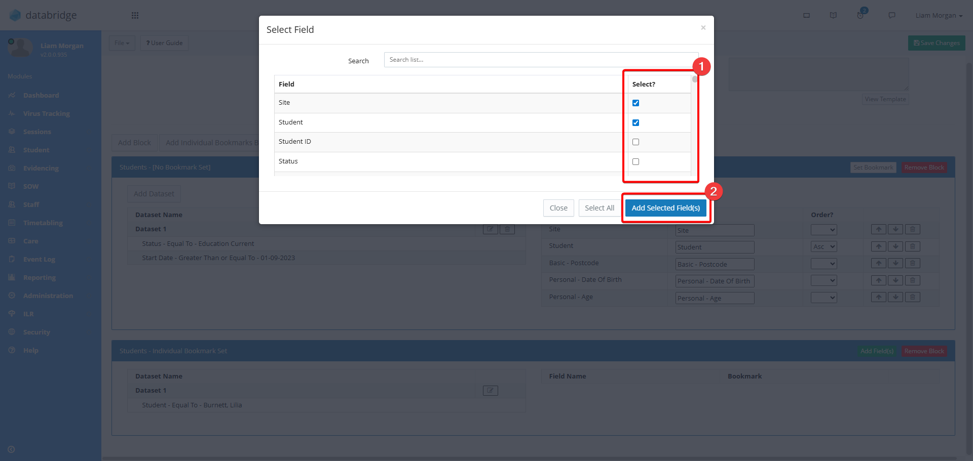 13. This will bring up a window with a list of the different fields that you can include on the report. Use the checkboxes to select the fields you require. Once selected, click on the Add Selected Field(s) button.