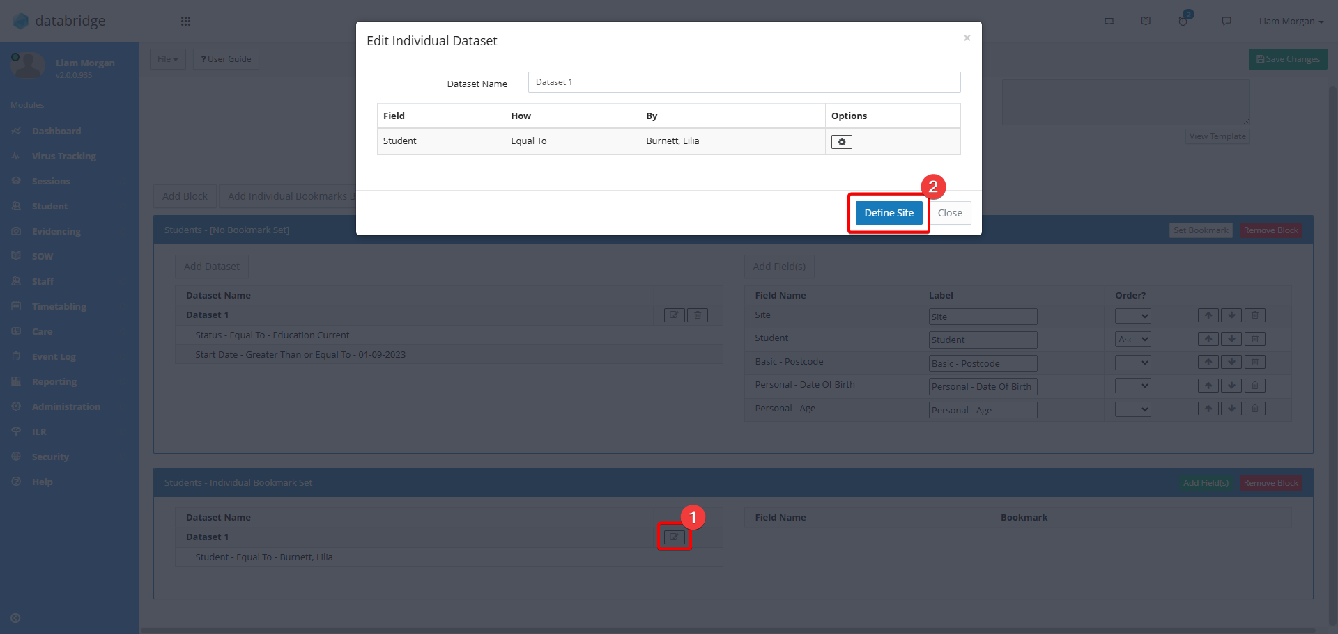 18. They will now appear in the Block on the lefthand side. If the learner is in multiple different Sites and you wish to only report on one site, you can define which site you wish to report on by clicking on the notepad icon for the Dataset, and then the Define Site button.