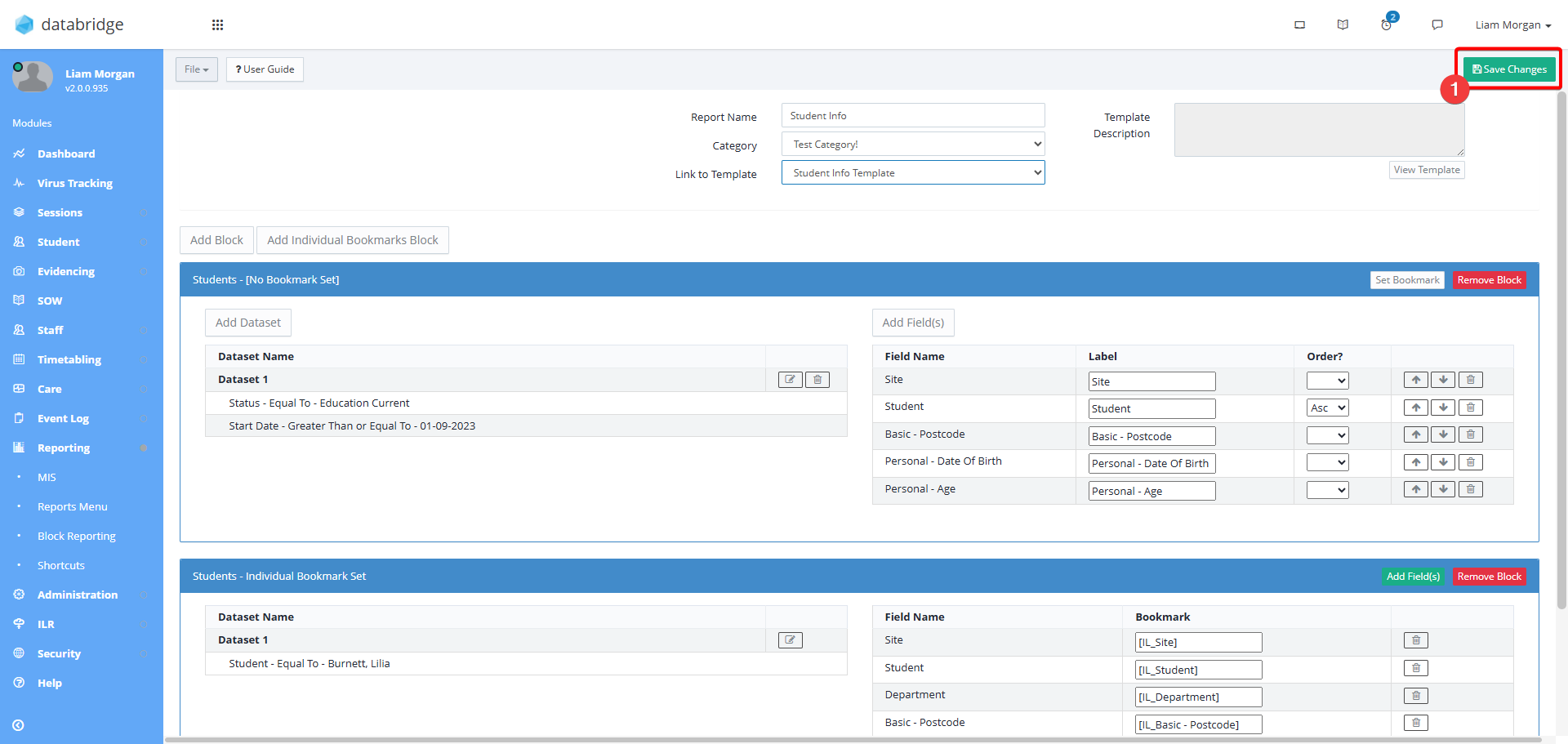 Individual Bookmark Blocks allow you to add Bookmarks to your Custom Report, signposting where you would like different fields of information to appear on your printout.