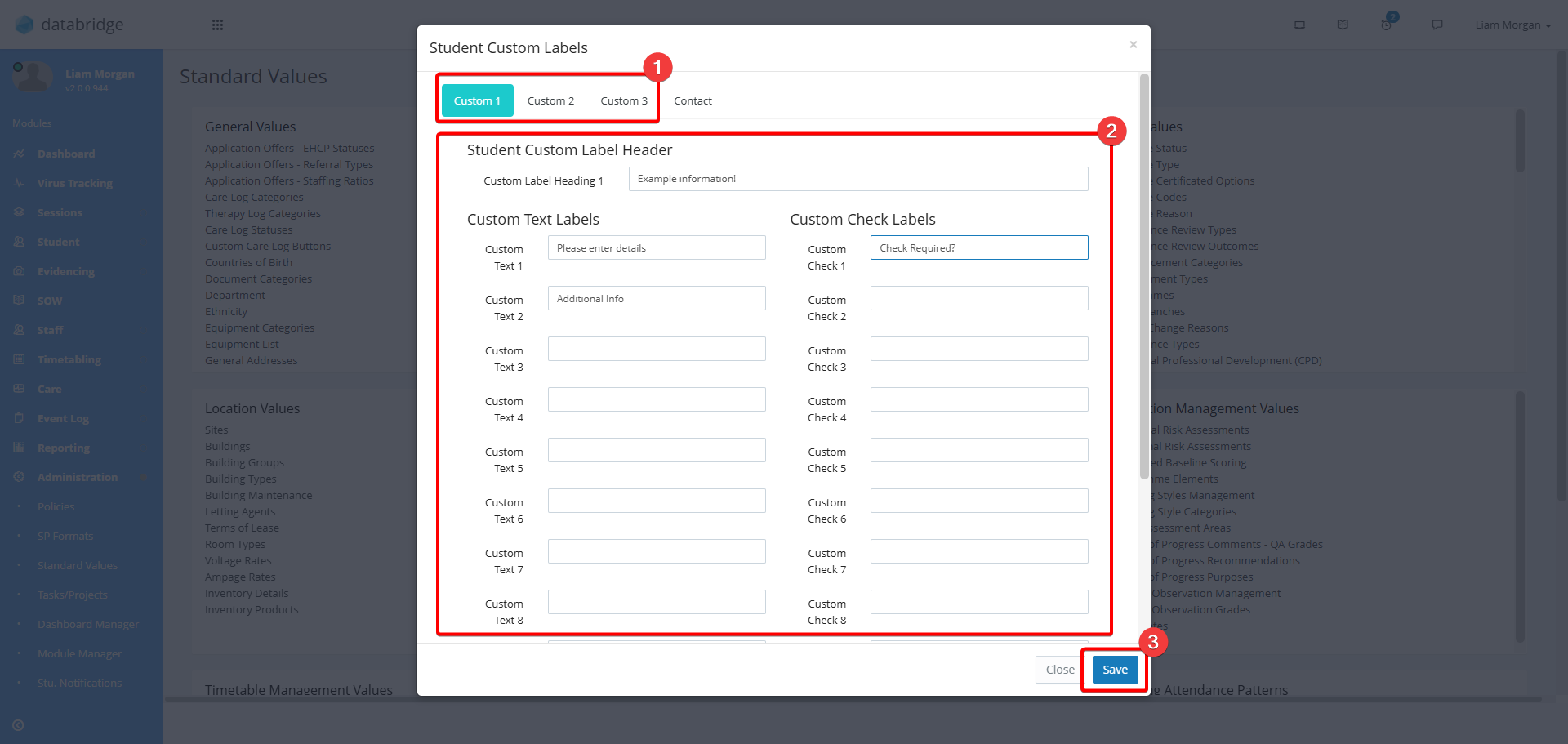 3. There are 3 custom tabs that can be used. Select the one you want to edit from the top bar and then enter the names of the custom fields within the textboxes.